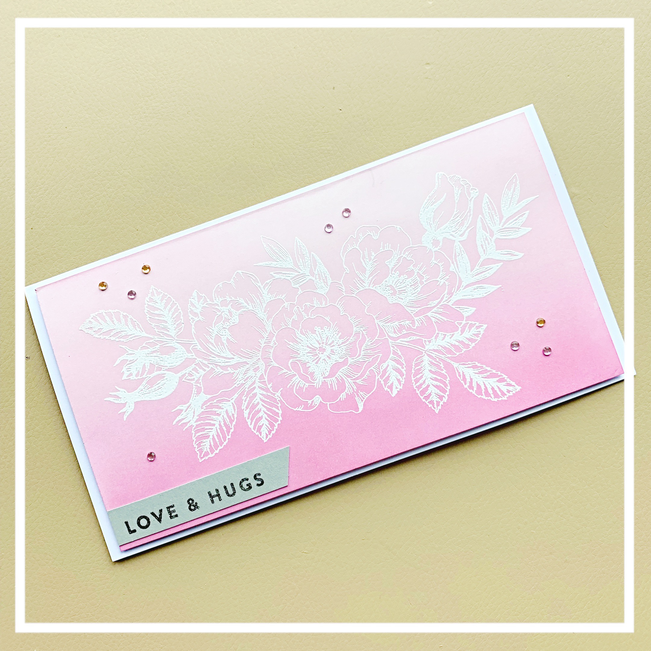 I started out by blending Distress Oxides in Spun Sugar and Picked Raspberry on a Bristol Smooth card panel. After letting it dry, I heat embossed the floral stamp. I treated my panel with antistatic powder and stamped the image with Versamark ink. I sprinkled on some white embossing powder and heat set it with my heat gun.
