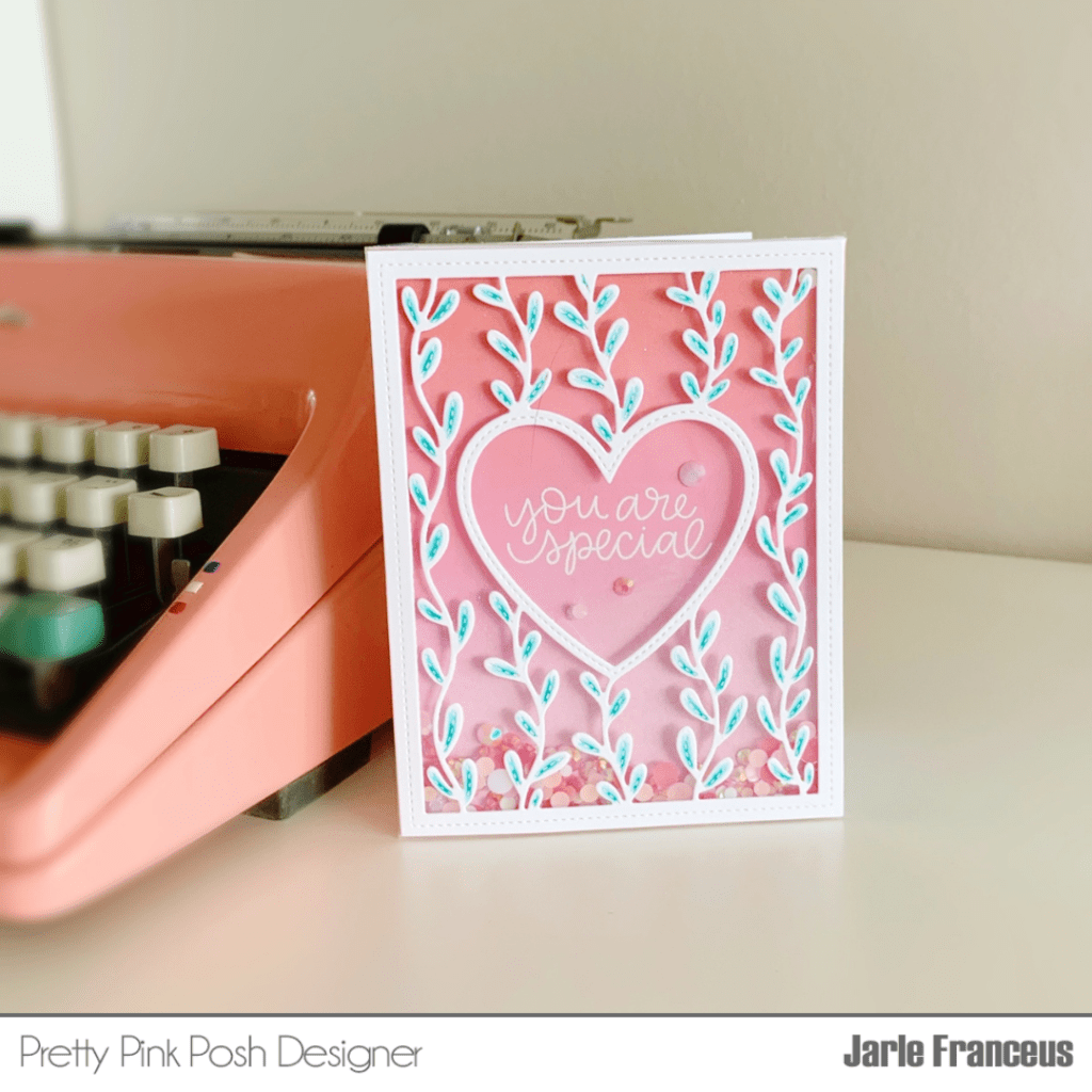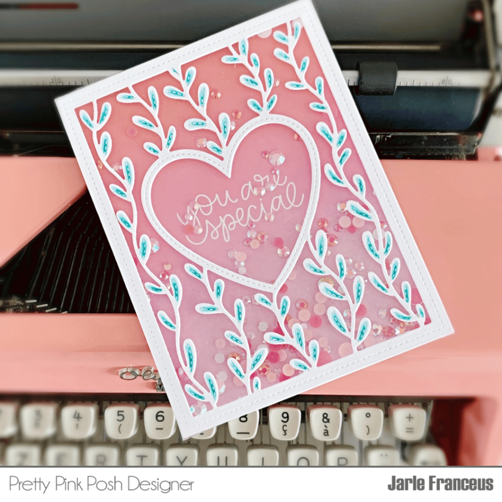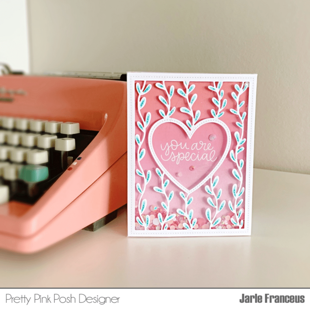 I adhered my Heart Vines panel on the shaker with some liquid glue and adhered it onto a card base. Really simple, but I am sure the recipient will be amazed when they open their envelope!