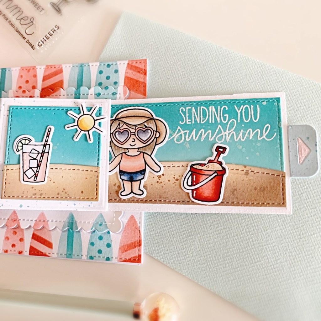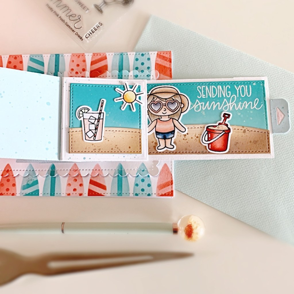 After die cutting, I adhered all the images to my panels. For the larger panel at the back, I first heat embossed the sentiment from the Summer Friends stamp set, before glueing the little girl down.
