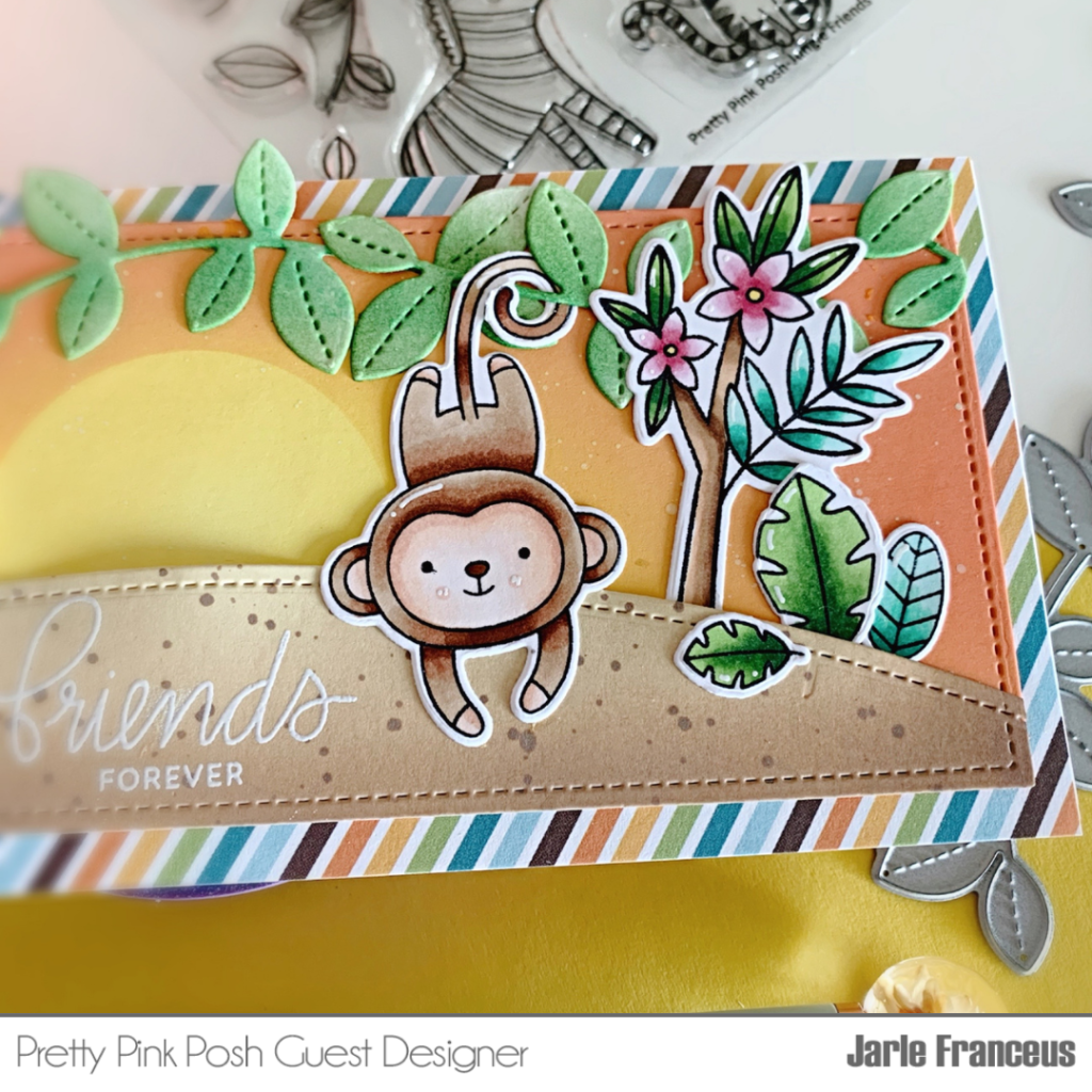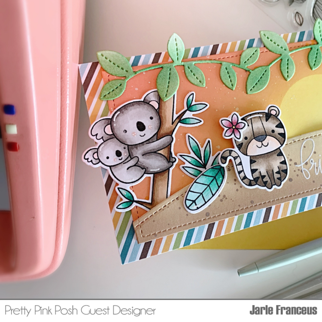 When my background was ready, it was time to decide what animals I wanted to use in my scene. I used a bunch of different stamp sets: Monkey Friends, Jungle Friends, Koala Friends and Tropical Toucans. I stamped them in a black Copic friendly ink, since I was gonna be doing some Copic coloring.