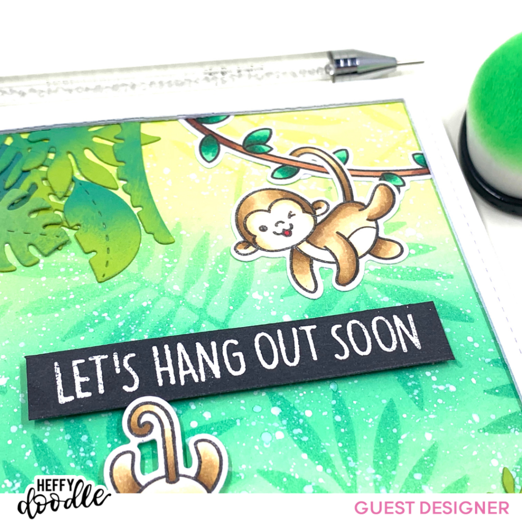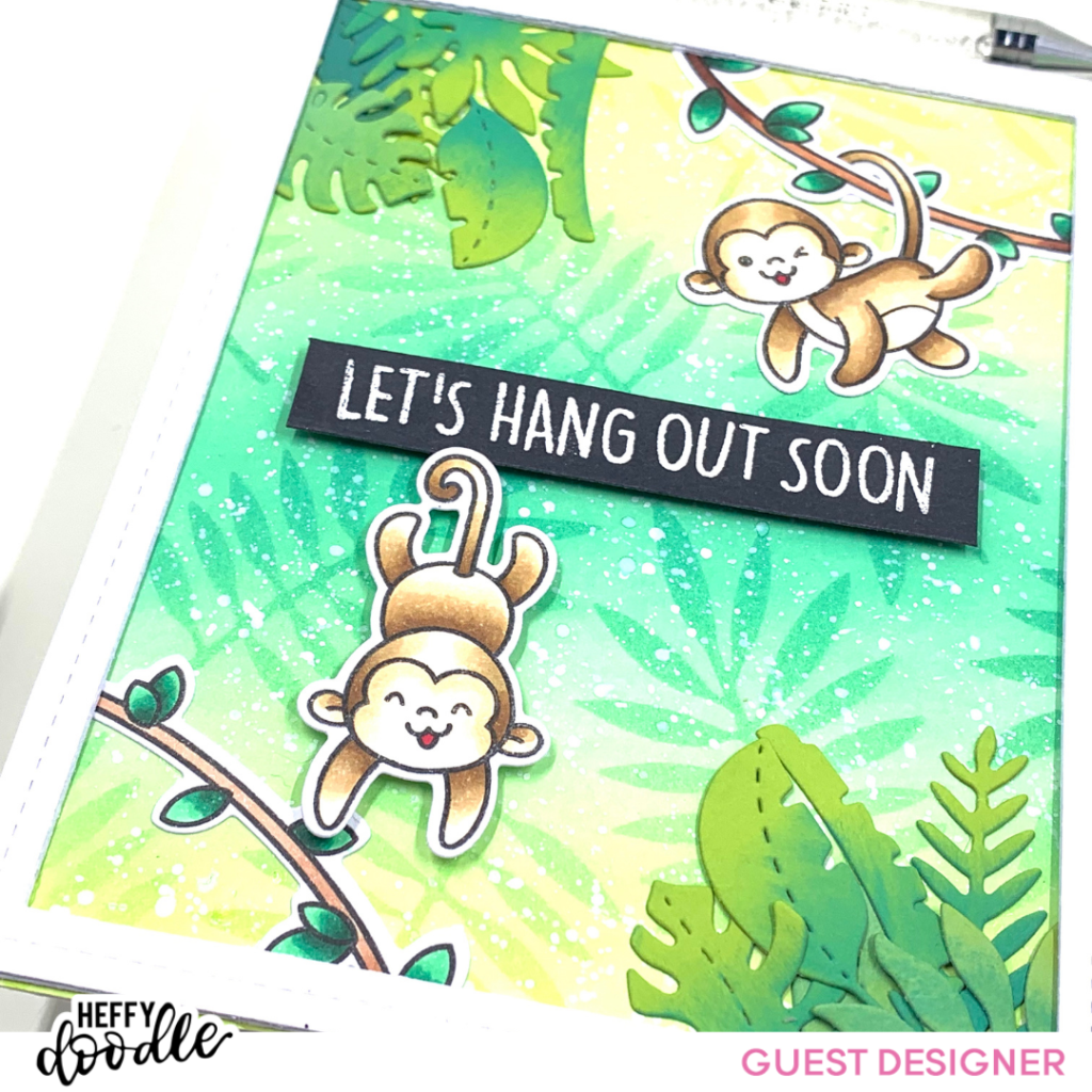 Time to assemble the card! I temporarily place down my frame and my sentiment onto the panel when trying to figure out where my images and all the leaves should go. I went for a sentiment in the middle of the panel and placed several of my leaves in 2 of the corners. I put down my monkeys where I thought they would fit best so that the lay-out of my card was just right.
