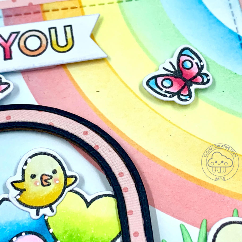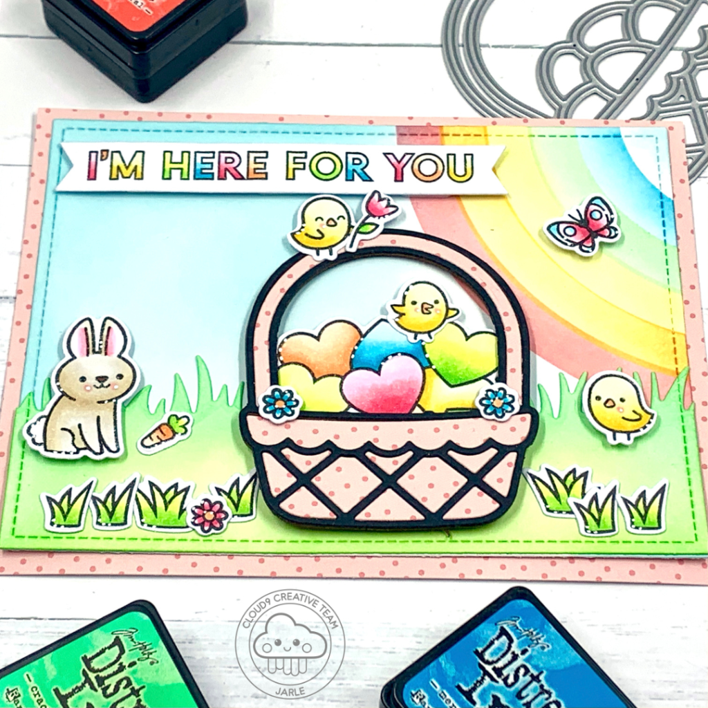 I die cut my rainbow sentiment with a sentiment banner and popped it on my card with foam squares. For my basket and all the images, I alterned between liquid glue and foam squares, just to give dimension to my card.
