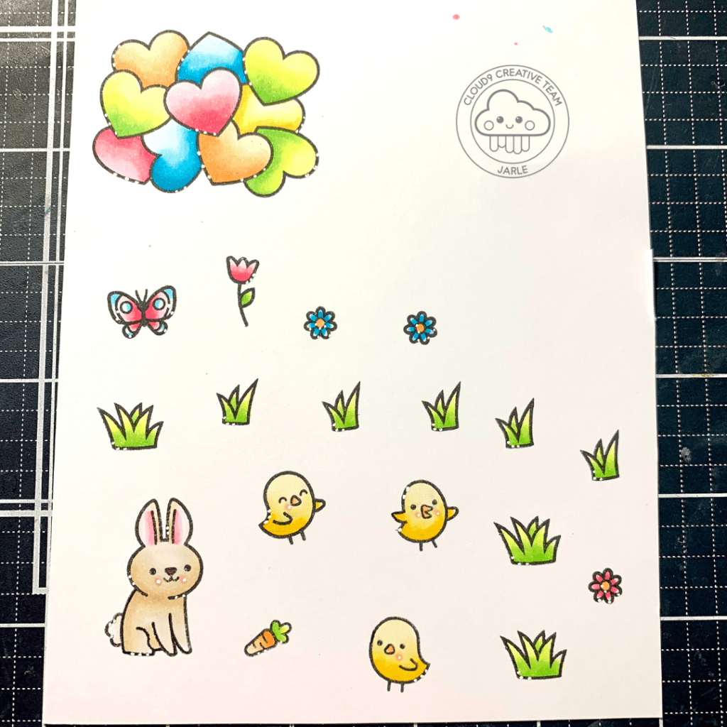 After that, I stamped all my images with Lawn Fawn Jet Black ink on Transotype Perfect Coloring paper. I used images from Eggstraordinary Easter, How You Bean Heart Add-On and Eggstraordinary Easter Add-On. After coloring them in and giving them some white gel pen details, I die cut them all with the coordinating dies.