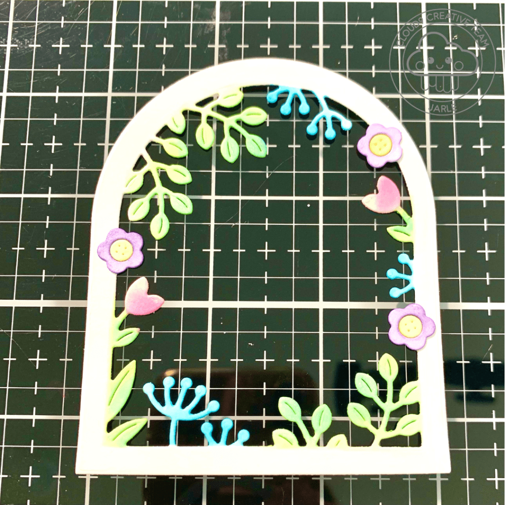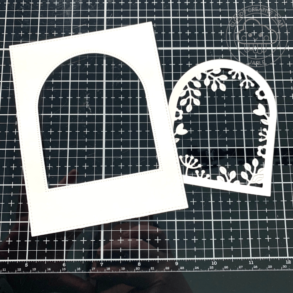 I started by die cutting a large stitched rectangle out of Bristol Smooth cardstock. I took the biggest die of the Secret Garden Window and die cut a window out of the Bristol Smooth card panel. I used the panel that comes out after the die cutting for my ‘floral scene’. So I die cut the floral die out of that ‘scrap piece’ of Bristol Smooth cardstock. I hope this makes sense. You can see the 2 pieces in the picture below.