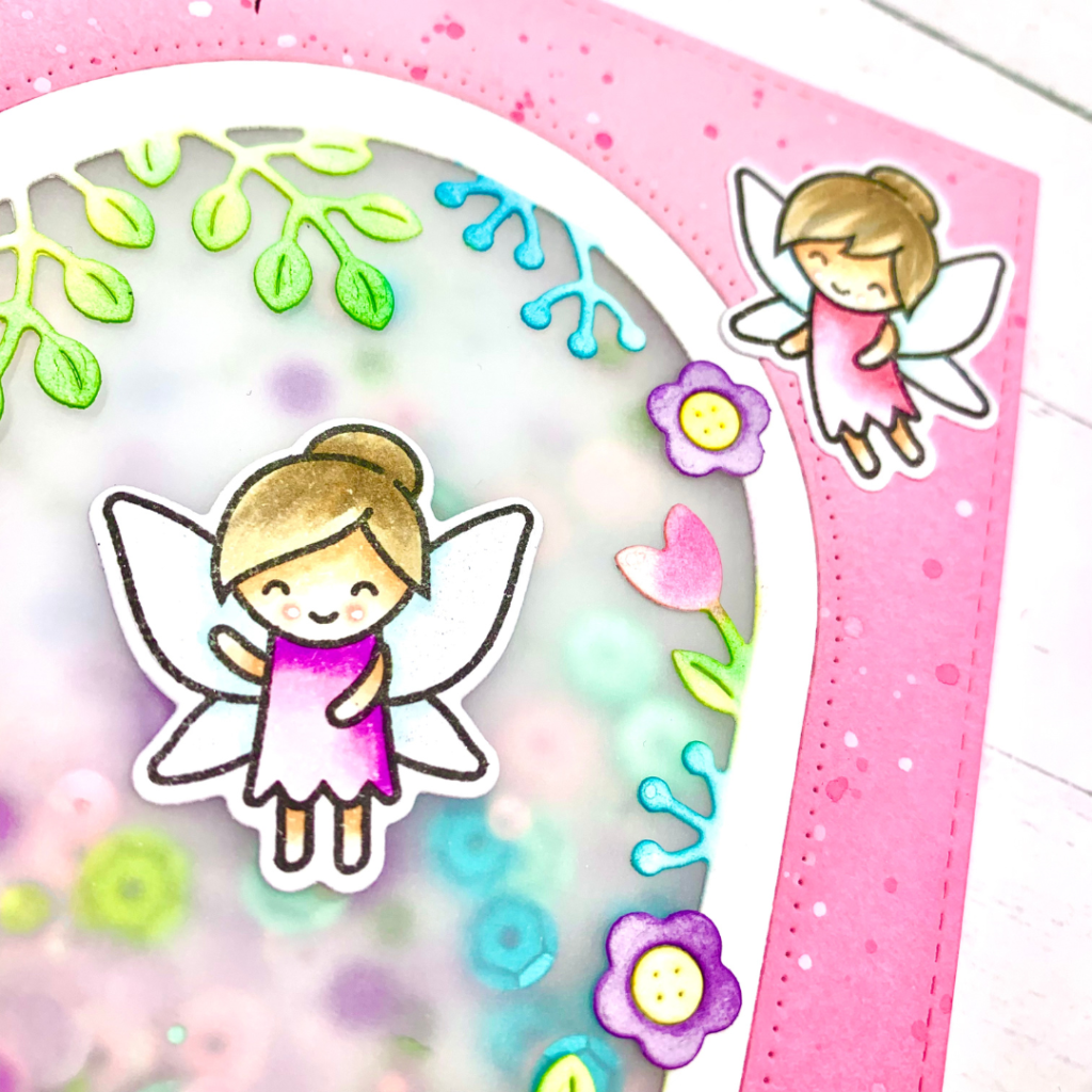 I adhered the sentiment and the 3 fairies onto my card panel with liquid glue. I also added a subtle touch of glitter on the fairies’ wings with a glitter pen.