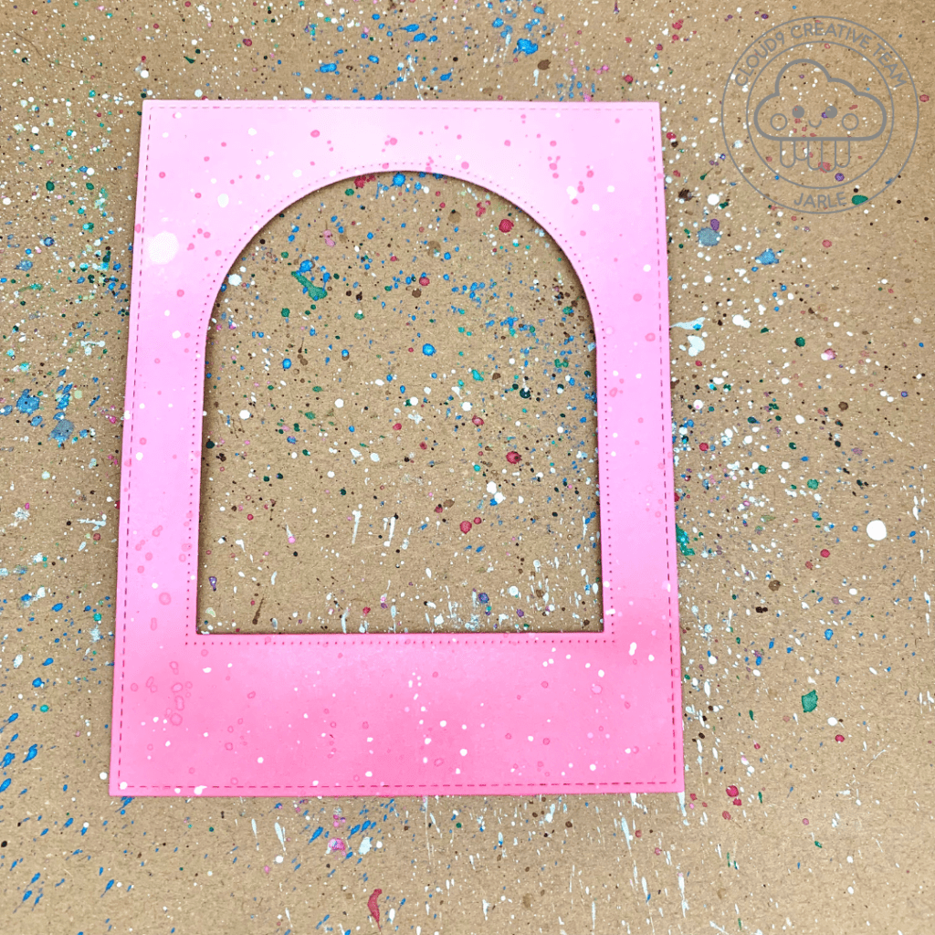 After that I could start my ink blending. The large panel was inked with Distress Oxides in the colors Spun Sugar, Kitsch Flamingo and Picked Raspberry. I splattered on some Copic White as well as some diluted Picked Rasberry. It kinda looked like the Spiffy Speckles paper, so if you don’t feel like inking, you can always use this patterned paper 🙂