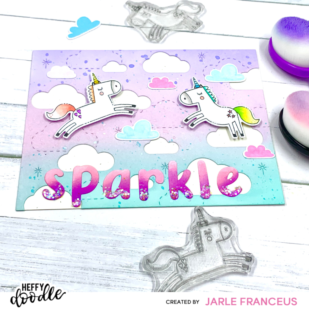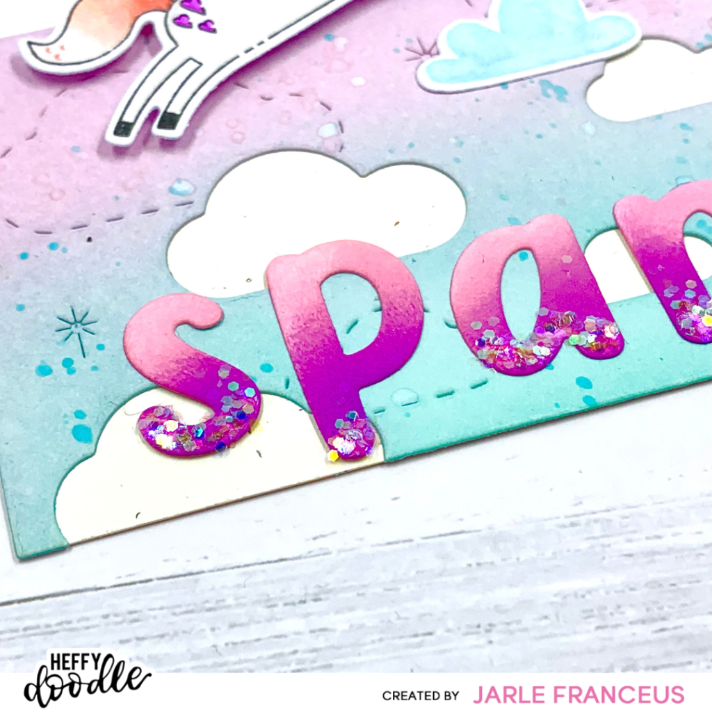 For my sentiment, I die cut the work ‘sparkle’ with the Heffy Doodle Moxie Alphabet dies. I blended a bit of ink with Kitsch Flamingo and Wilted Violet on each of the letters. After that, I added glue with my Quickie Glue Pen and dipped the letters in some Chunky Glitter.