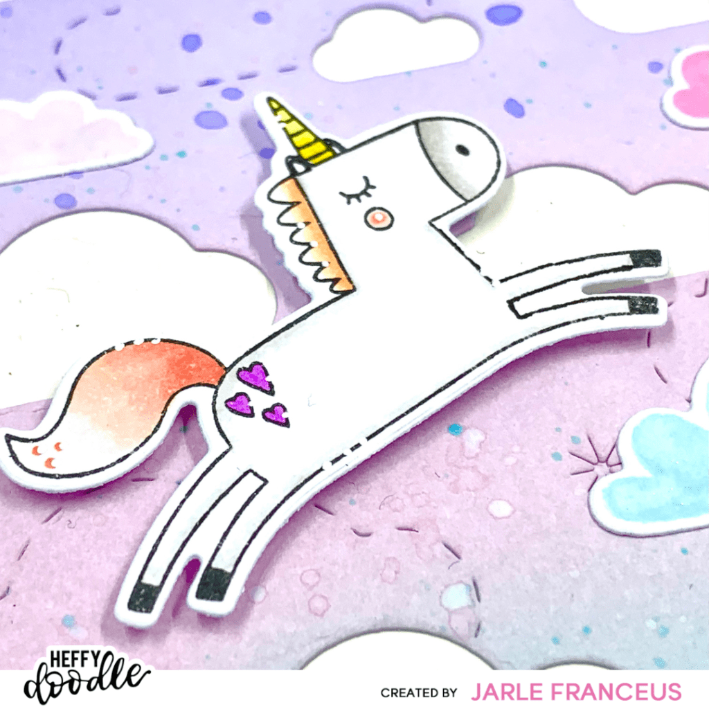 When everything was dry, I started by adhering a light beige cardstock behind the ink blended panel. Then I placed down all my images. The clouds were glued flat on the card panel. I did the same with the sentiment. I let the unicorns stand out a bit more by putting them down with foam squares.