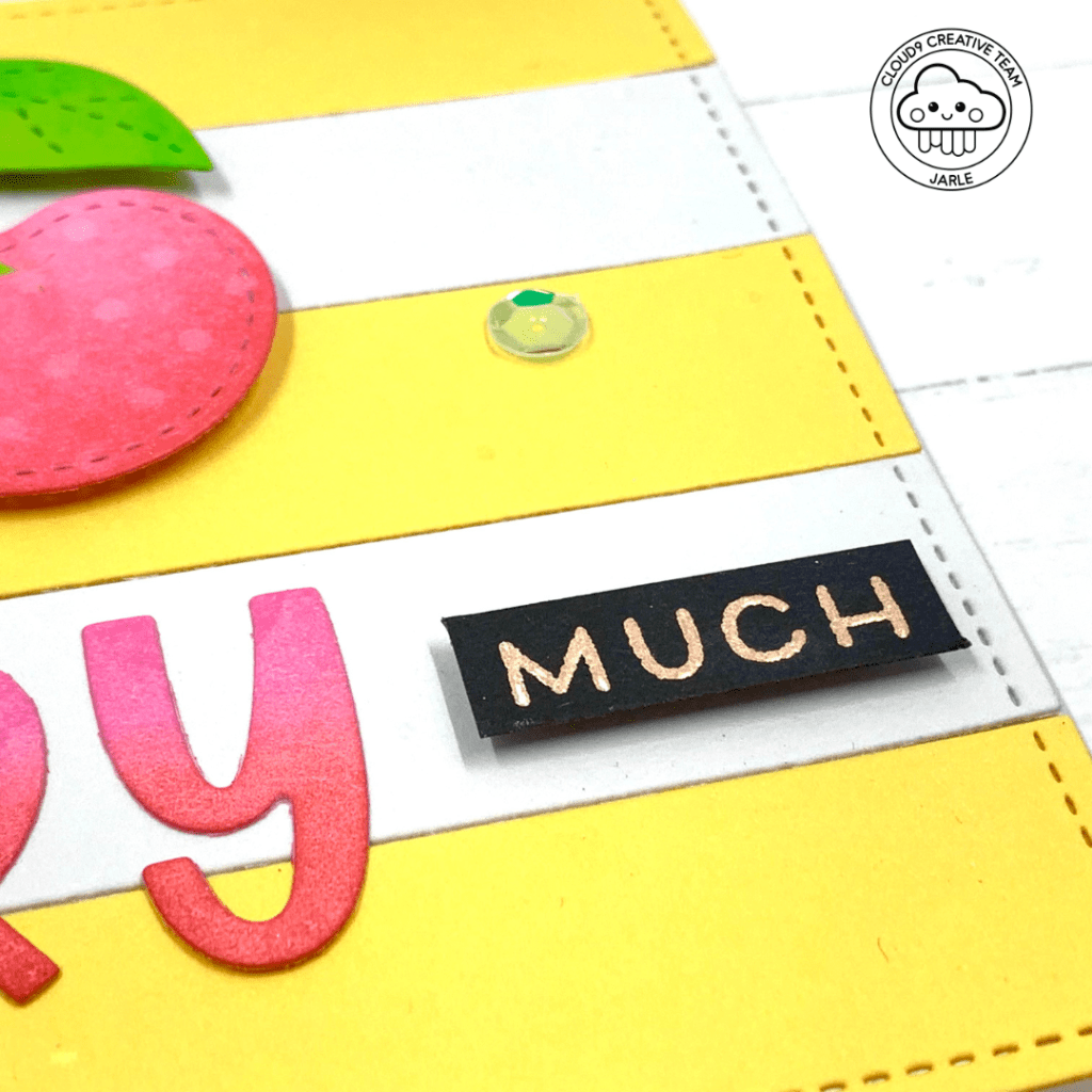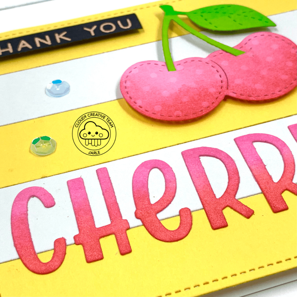 Then I assembled my sentiment. I cut the heat embossed sentiment in 2 pieces, leaving out the word ‘so’. I could ‘insert’ my cherry die cut letters in between the 2 pieces. So my sentiment eventually says: Thank you CHERRY much. Fun, right?
