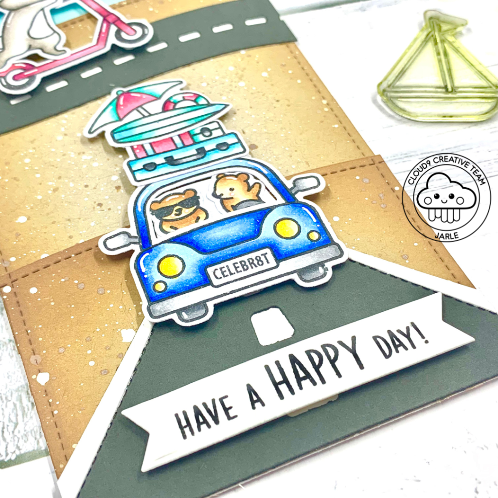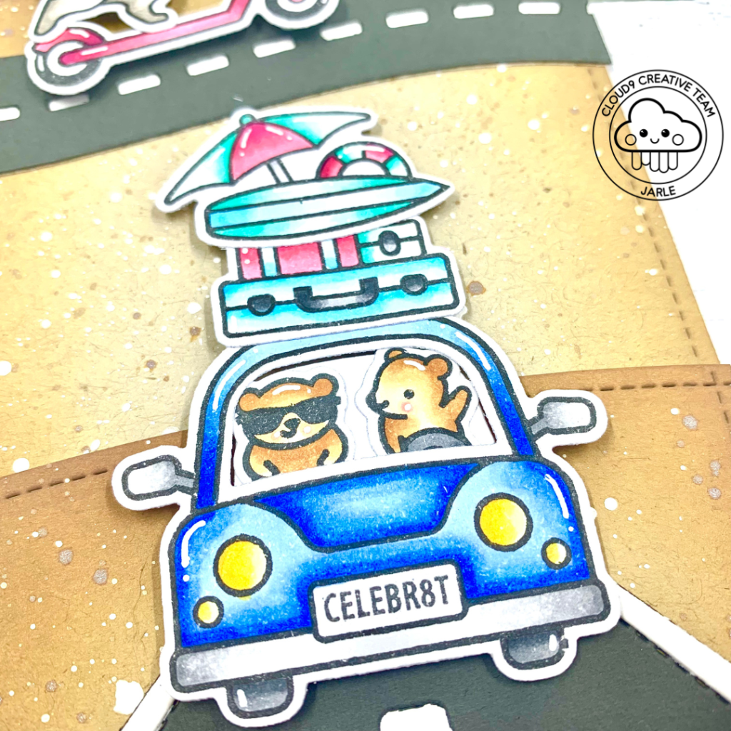Time to stamp and color the images from Smooth Sailing, Scootin’ By, Car Critters and Car Critters Road Trip Add-On. I stamped them on Transotype Perfect Coloring paper with Lawn Fawn Jet Black ink. After letting it dry for about 5 minutes I colored the images with my Copic Markers. After that, I die cut them with the coordinating dies.