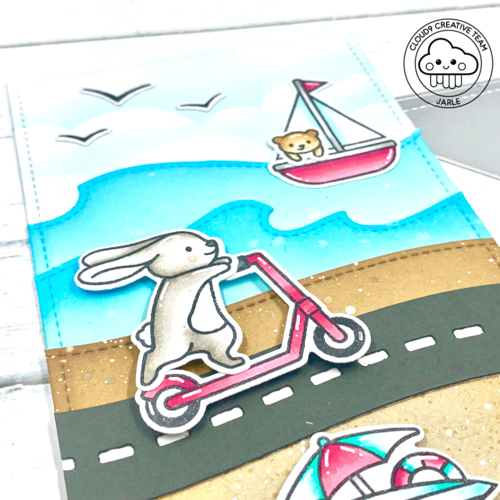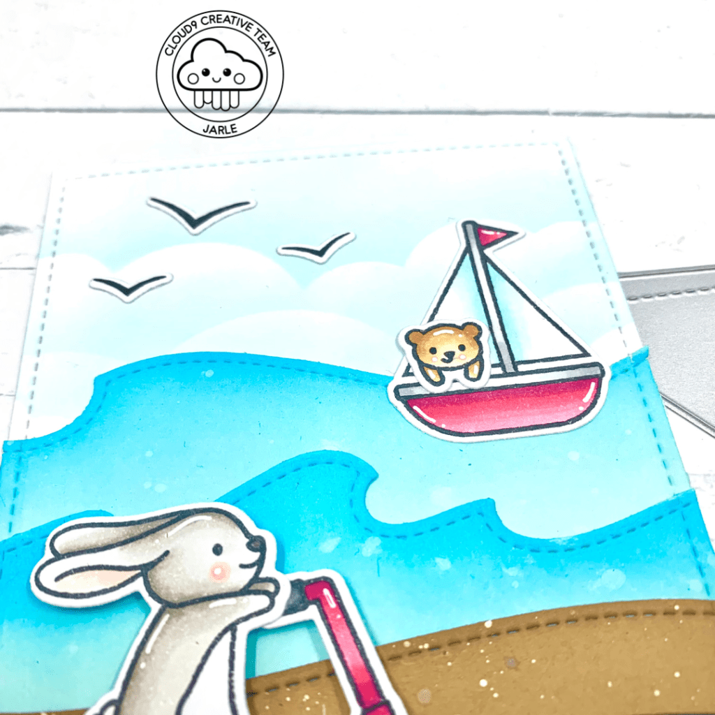Time to assemble the card. I started with my base and I just adhered all my cardstock pieces on that slimline base. Then I put down all my images. The boat and birds were adhered flat with liquid glue. The other images were put down with foam squares. This adds lots of dimension!