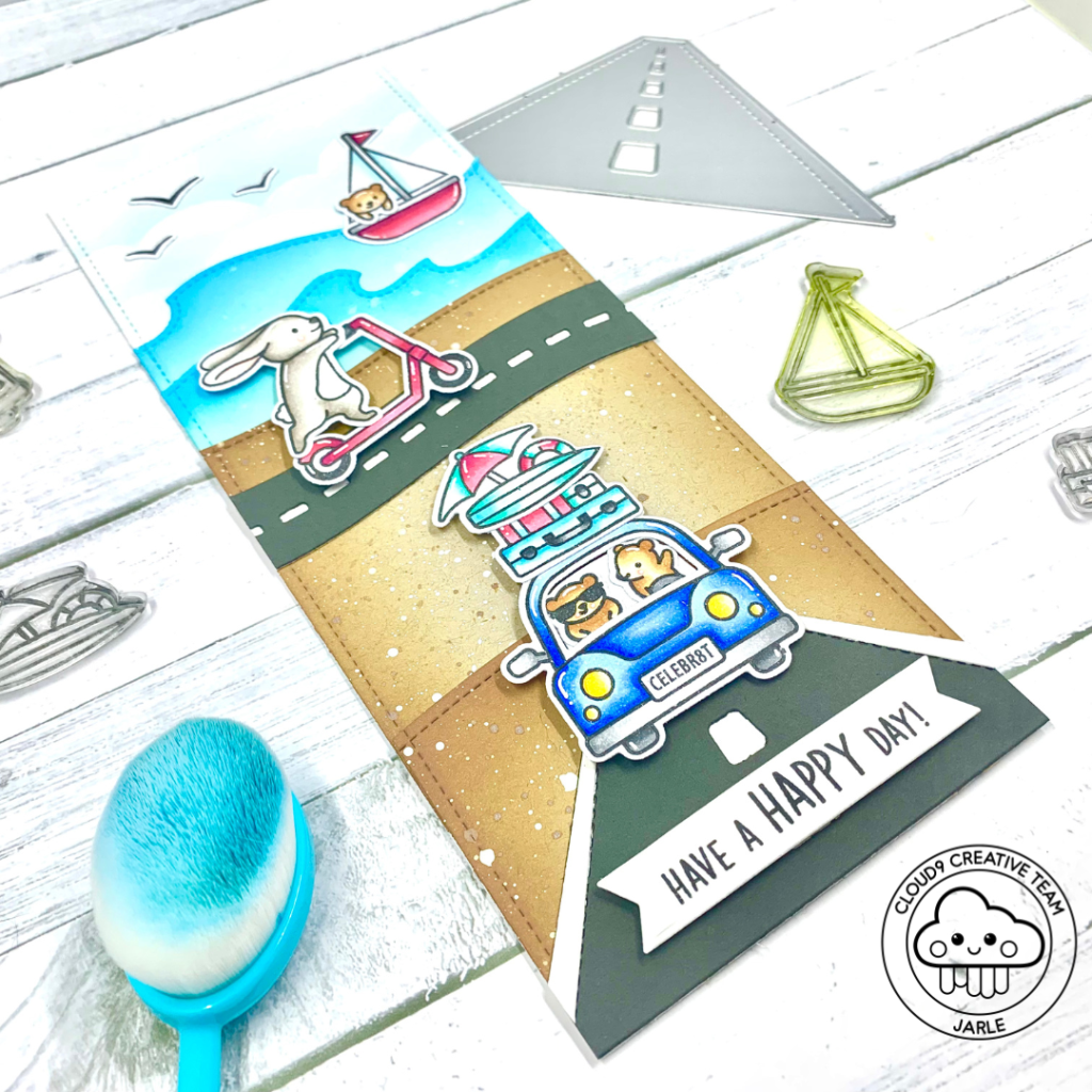 After that, I die cut 2 roads from Storm Cloud and regular white cardstock. I did one with the new On The Road and one with the older Road Border. I adhered down all the pieces so I had 2 roads to integrate on my slimline card.