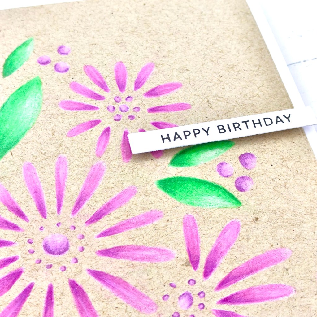 For my sentiment, I stamped a little ‘happy birthday’ out of the Simple Sentiments set from Pretty Pink Posh with Versafine Onyx Black ink on a scrap piece of white paper. I die cut it with a sentiment strip and placed it on the card with a little foam strip.