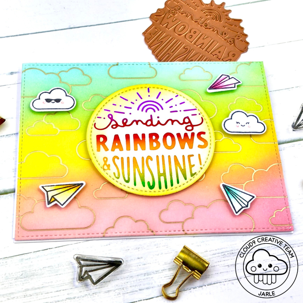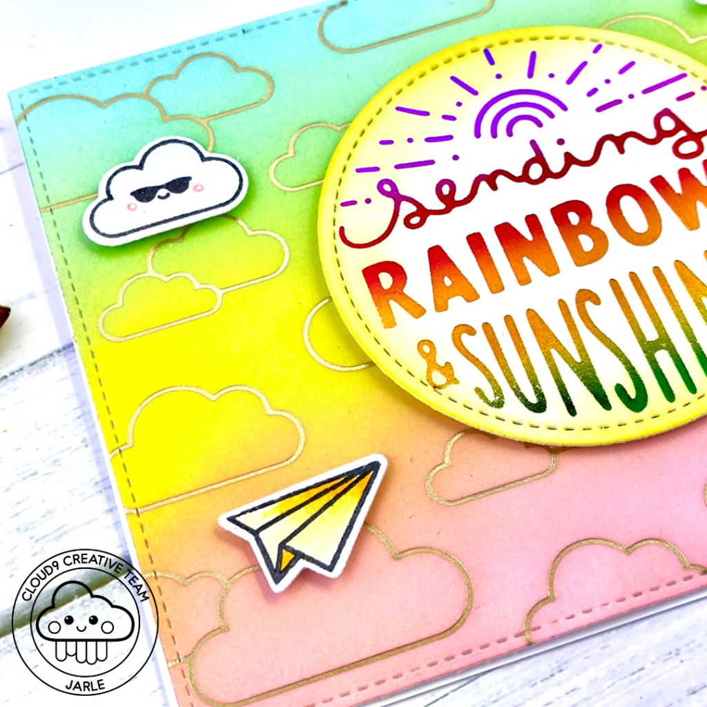 Then I repeated the same process with the foiled sentiment (which was the Sending Rainbows from Lawn Fawn). I did use rainbow foil this time. You can’t see it in all of the pictures, but that rainbow sentiment is SO beautiful. I love that the color shifts when you tilt it to the light. I die cut the sentiment with an Outside In Stitched Circle (Lawn Fawn again) and blended the edges a bit with Squeezed Lemonade. I popped the sentiment up in the middle of the cloud background panel with a bit of foam tape.